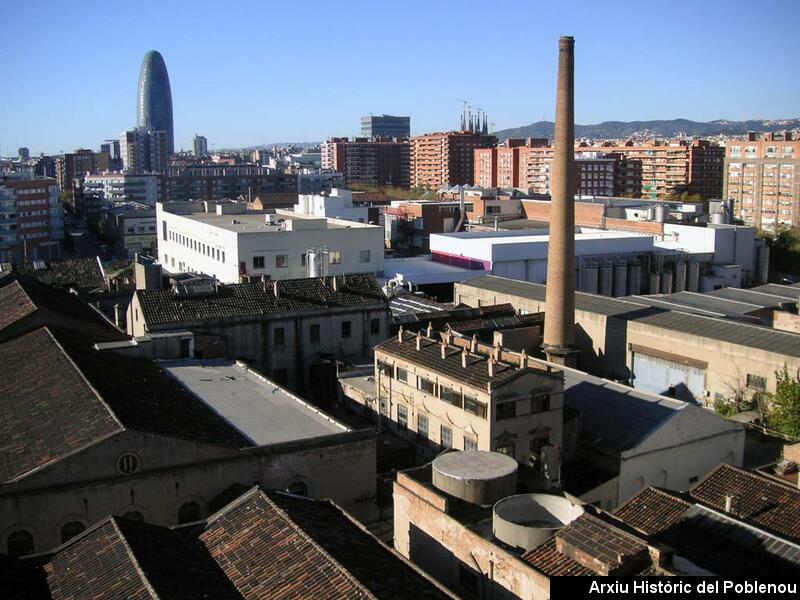Can Ricart. Panoràmica des d'un terrat del carrer Espronceda. Xemeneia. Al fons, Frigo-Farggi.
