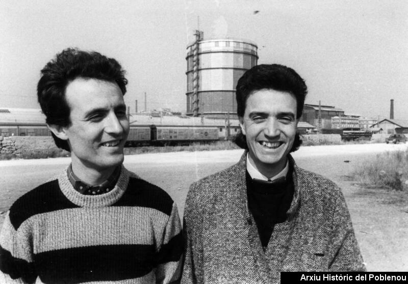 Dionís i Antoni Olivé Cabré, fundadors del grup musical Melodrama el 1976, a la platja de la Mar Bella. Al fons la fàbrica de gas i l'estació de tren del Poblenou. Gasòmetre M.A.N. Fons Família Olivé.